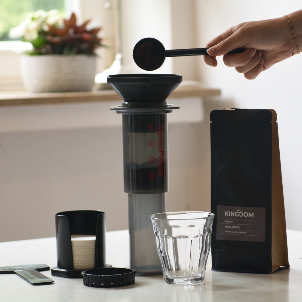 To clean the Aeropress, remove the cap and push the bpuck and the filter paper out. Rinse gently with mild detergent and water and place on the drying rack. Enjoy your freshly brewed Aeropress coffee!