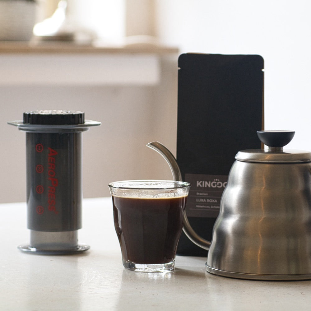 We like the Aeropress brewer because it is light, durable and compact. The Aeropress presents numerous experimental brewing