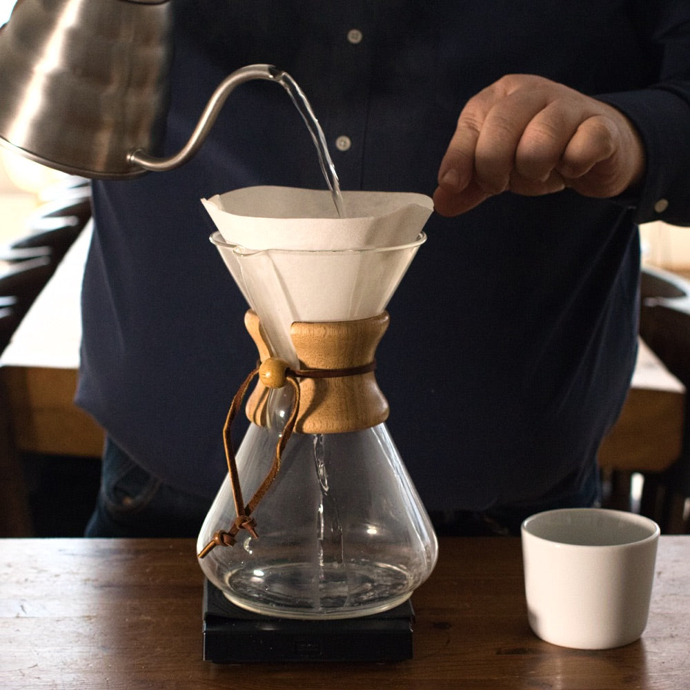 Thoroughly saturate the filter, because it is thicker than standard drip coffee paper filters. This will also warm the glass of the Chemex. Decant the water through the pour spout.