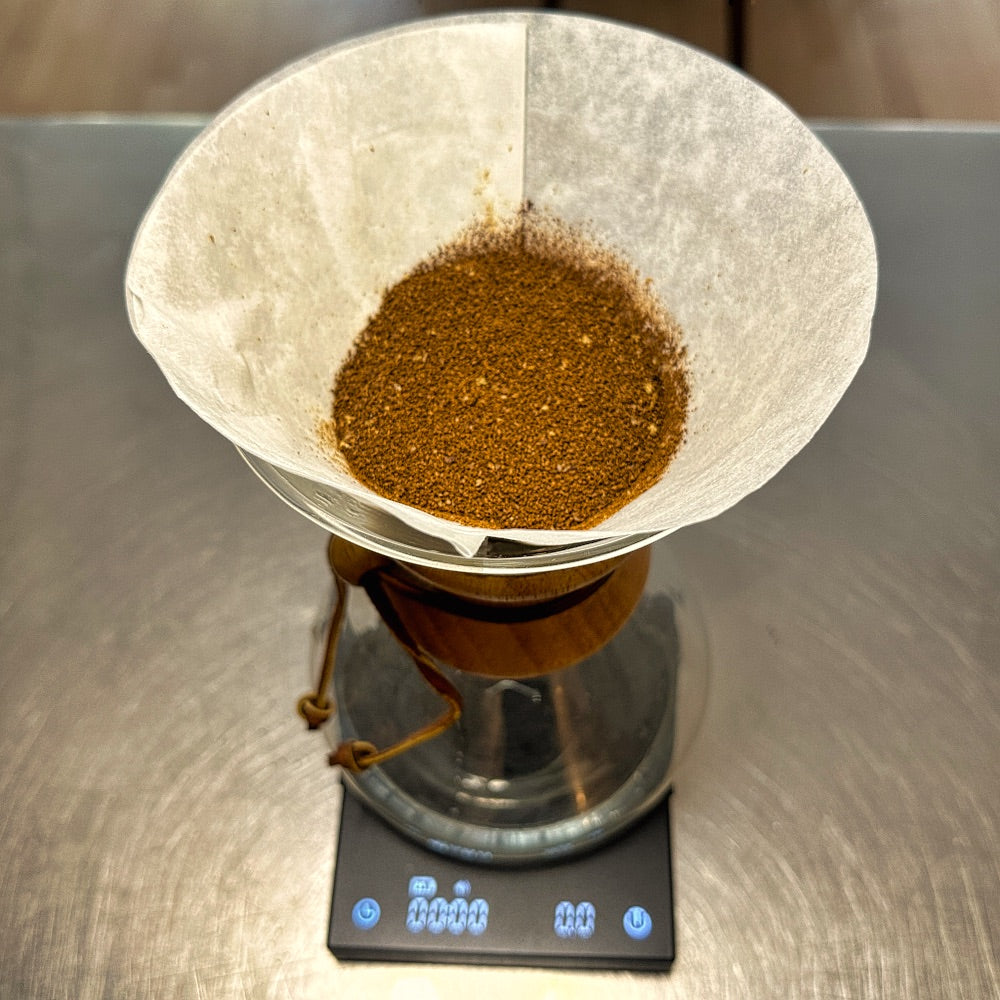 Put your Chemex on the scale with the saturated paper filter, ensure the water is decanted, and zero the scale. We recommend you use 65g of freshly ground coffee (10 cups). Throw coffee in paper filter and shake gently to level. Zero your scale again to prepare for the pour.