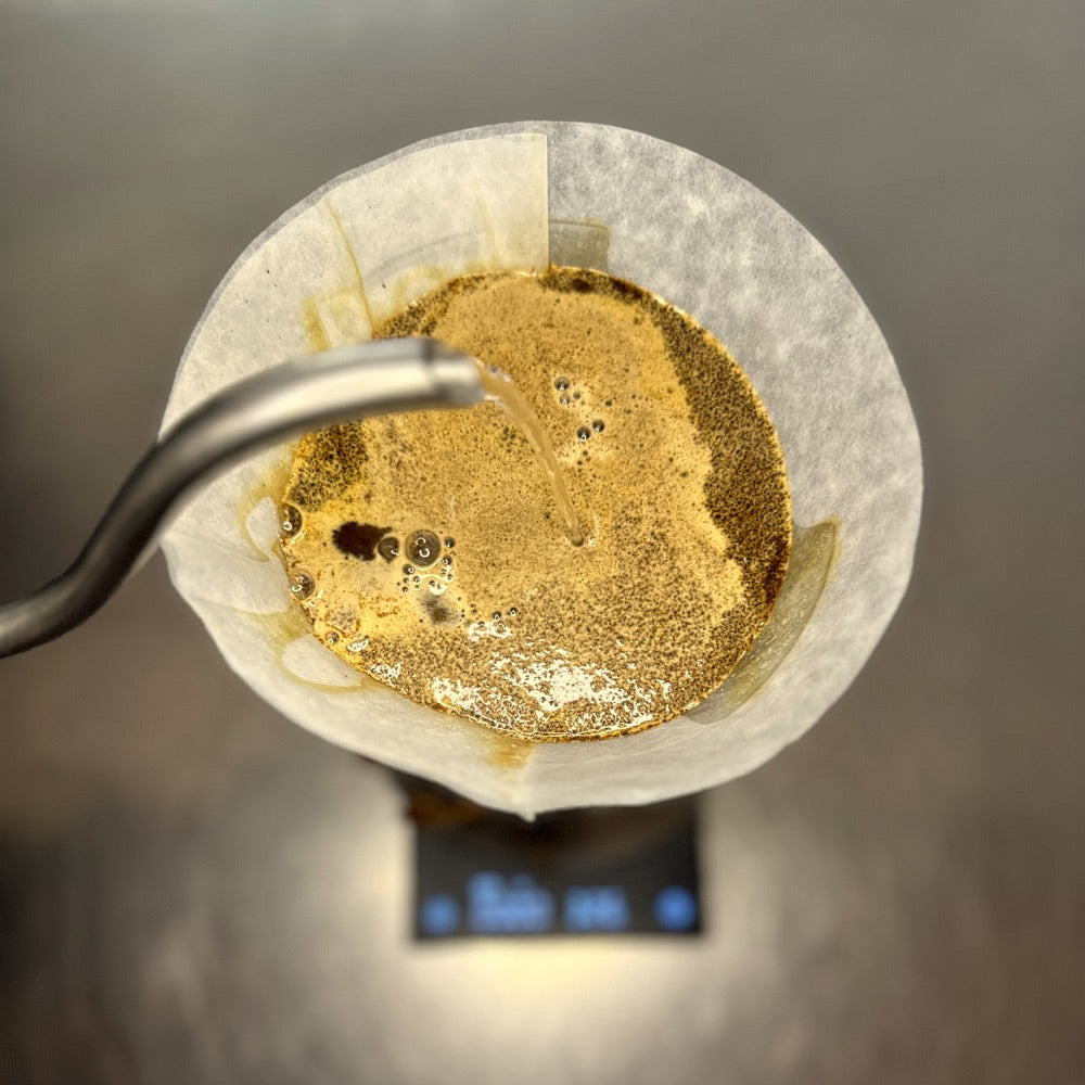 coming to the outer edge for bypass. This is when coffee flows behind the coffee through the filter paper down the glass side without passing through the coffee. Give a quick stir to ensure all grinds are completely saturated. Allow to bloom for 1 minute.