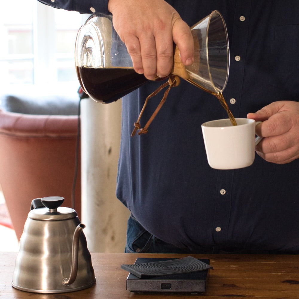 Once the coffee bed is completely dry and the coffee has stopped dripping, give your Chemex a gentle swirl to fuse all layers of flavour. Carefully remove the paper filter and dispose of it. Enjoy your freshly brewed cup of coffee.