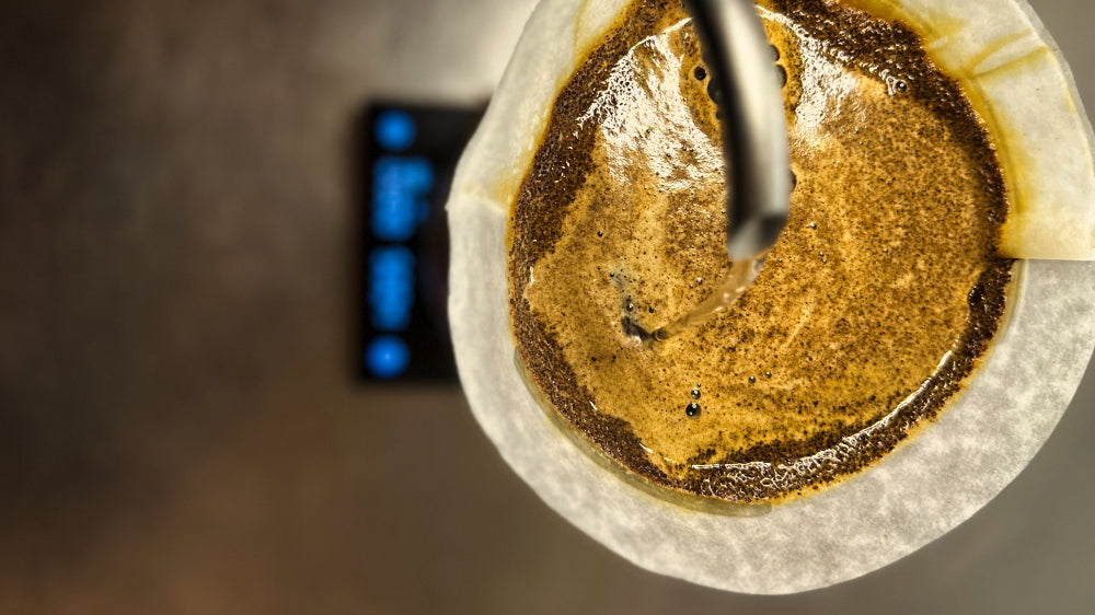Pour in the same way, starting at the centre, moving outwards in concentric circles and back in again, repeating the process. After the second pour, allow the coffee bed to drain completely until you don’t see water on the surface of the coffee bed.