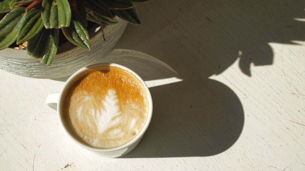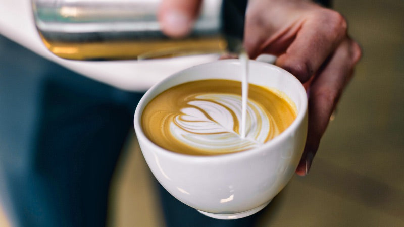 Take your cup in your left hand or reverse if left-handed. Angle it down towards the milk pitcher and start pouring from a height of 5cm, a thin line of milk disturbing the crema surface as little as possible. When the cup is halfway full, bring the spout just above the espresso crema surface and create the art of your choice.