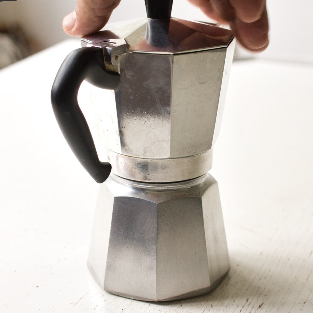 Since the bottom is hot, use a cloth or heatproof glove for the next step. Screw the head of the Moka pot onto the base, ensuring that you have a proper hand-tight seal and place it on the stove.