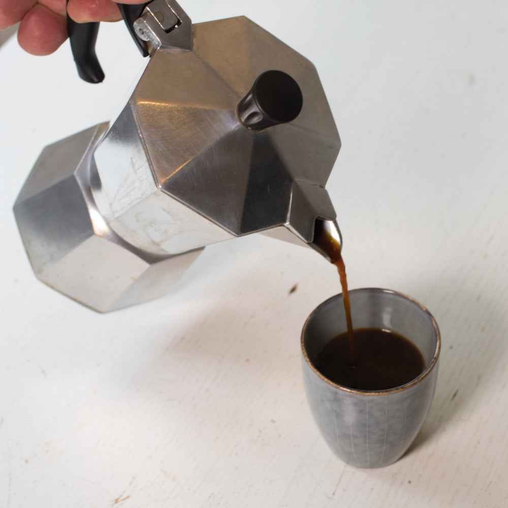 We suggest a lower heat to ensure that the coffee comes out of the spout at a slow to medium speed. If it comes spattering out, the heat was too high, and the extraction was too fast. Once the coffee starts pouring through the spout, remove the Mokka pot from the stove or lower the heat to the lowest setting. Carefully swirl the coffee and stir with a spoon to ensure that all flavour levels are mixed together.
